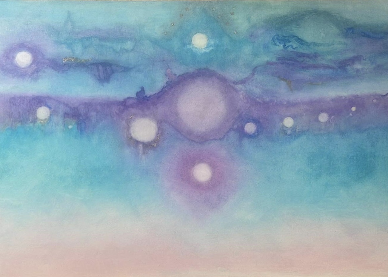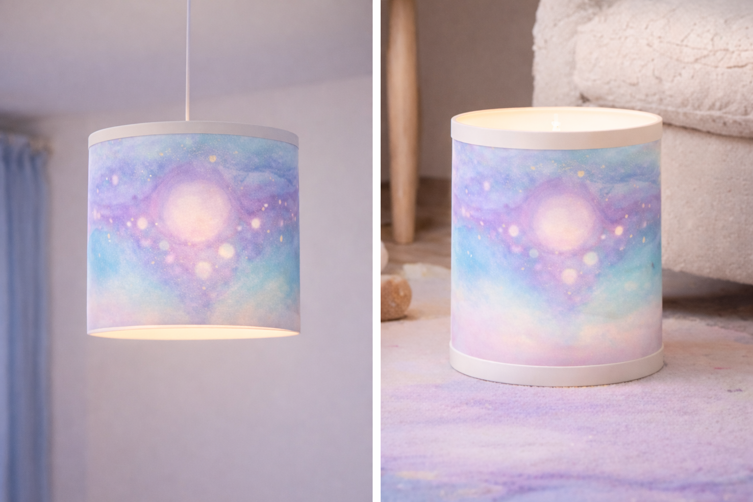 Petite lumière, œuvre unique peinte à l’huile, dont les motifs sont transposés en objet pour offrir à l’enfant un espace apaisant dans une recherche poétique.